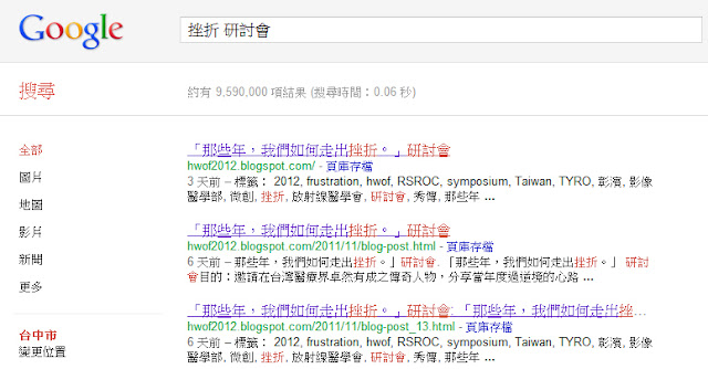 「那些年」研討會網站,上線僅六天(2011/11/14-2011/11/20),在「挫折 研討會」的Google關鍵字排行已經衝到第一名,連第二、第三名都一起包辦。